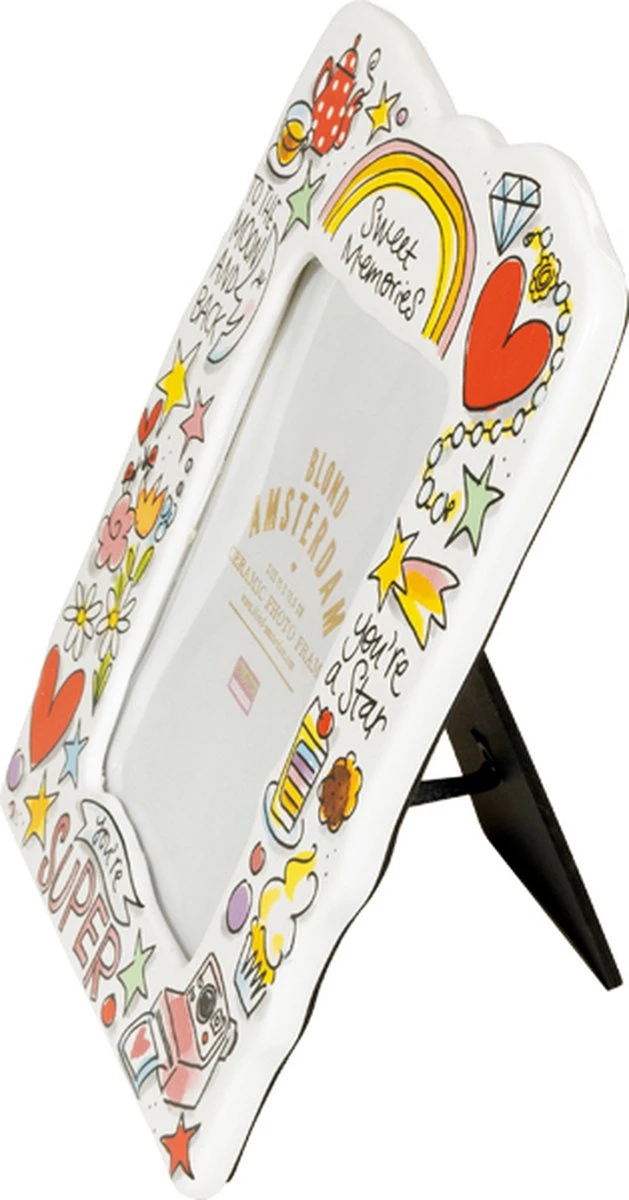 De collectie Even Bijkletsen is nog steeds de grote favoriet van vele Blond-liefhebbers. Nieuw in deze collectie zijn onze vrolijke Blond fotolijstjes gemaakt van aardewerk. Op de randen van dit fotolijstje staan vrolijke tekeningen. Plaats de foto van jouw superstar erin en maak je huis gezellig met dit Blond geillustreerde fotolijstje of geef hem cadeau.