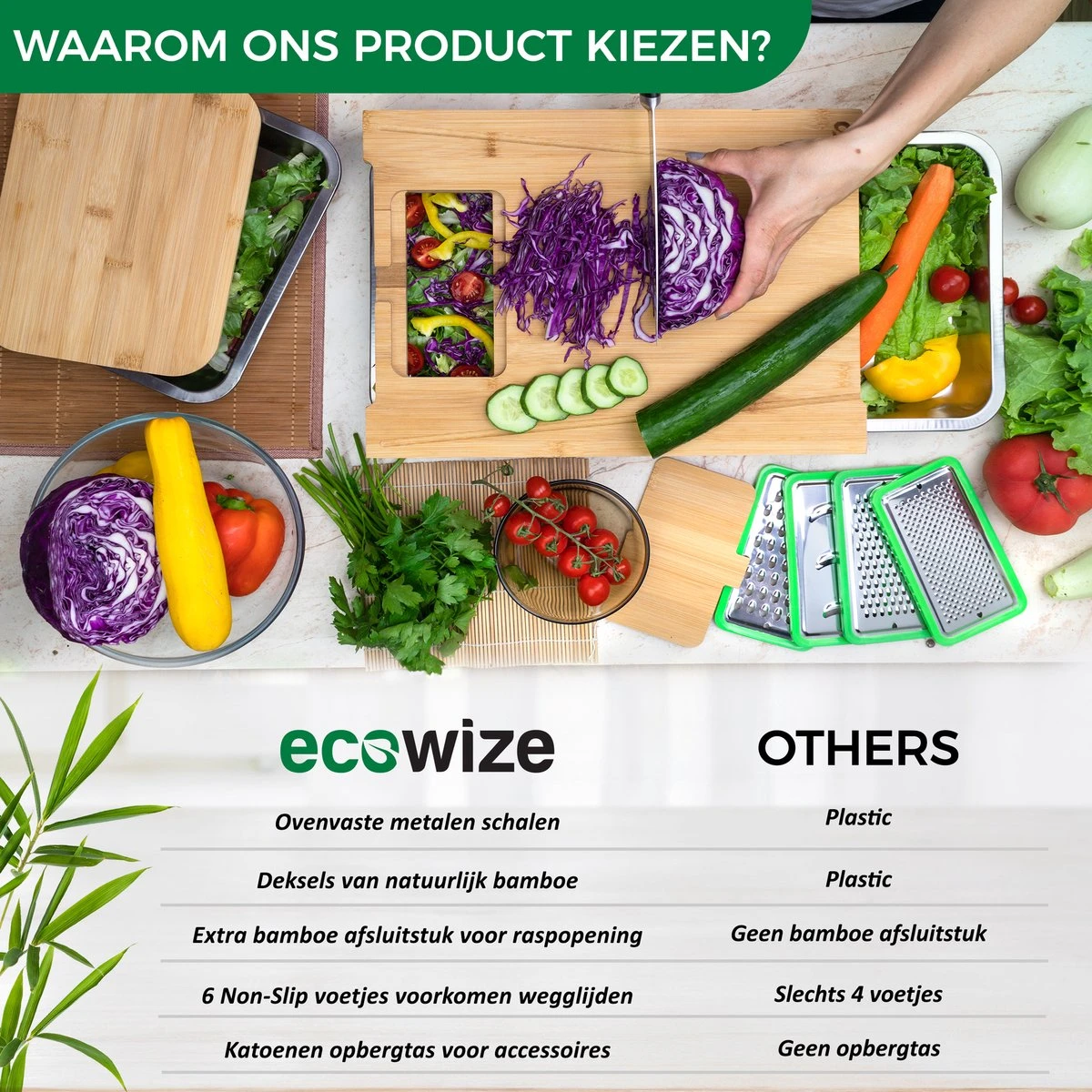 Ecowize 3-in-1 Bamboe Snijplank Met Opvangbak – Snijplank Hout Incl. 3 Roestvrijstalen Opvangbakjes Met Bamboe Deksel, 4 Inzetbare Raspen – Groentesnijder, Hakblok, Borrelplank, Tapasplank, Broodplank – 40x30cm – Duurzaam Cadeau