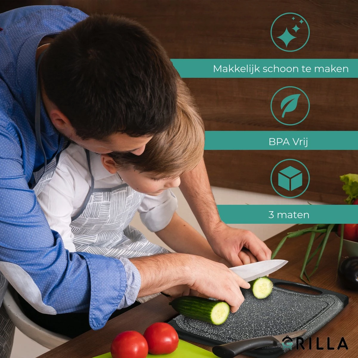 De Grilla snijplanken voor de keuken hebben diepe groeven die vlees en vruchtensappen opvangen. Zelfs tijdens de drukste kookmomenten is uw werkplek altijd schoon en overzichtelijk.